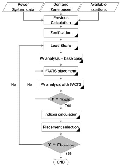 Once a load share scenario is created, the FACTS allocation procedure is initiated. In the first step, a PV analysis is performed to evaluate the voltage stability of the current system configuration without FACTS device. Thereafter, for each of the predefined available locations, the device is set and configured at the corresponding node, and the PV analysis is then reinitialised. This procedure is repeated for each load share scenario, respecting Equation (8) (Figure 3).