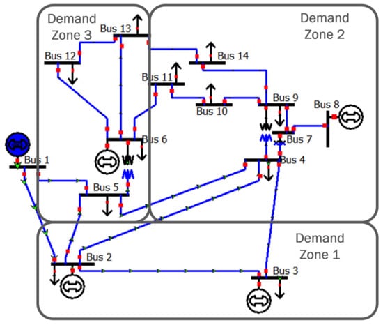 In order to facilitate the understanding of the results, we must provide further information about this research. On the one hand, we must point out that the available locations in which the STATCOM can be set are buses 4, 5, 9, 10, 11, 12, 13 and 14. On the other hand, we must define the three demand zones, which are formed by buses 2 and 3 (demand zone 1), buses 4, 9, 10, 11 and 14 (demand zone 2), and buses 5, 6, 12 and 13 (demand zone 3) (Figure 4). Transformers between buses 5 and 6 and between buses 4 and 9 serve as boundary of demand zone 1. Demand zones 2 and 3 comprise buses one and two buses away from transformers 4-9 and 5-6 respectively.