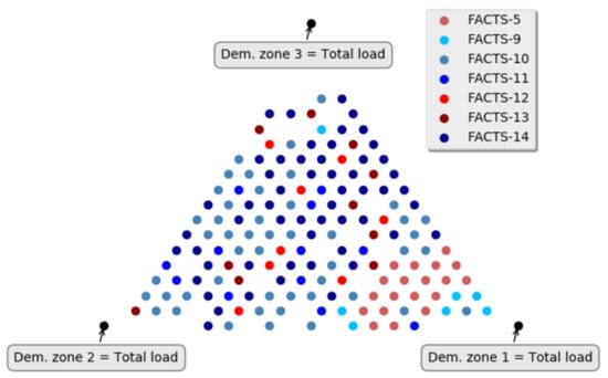 The triangle in the figures shows the best location of the STATCOM for each load share scenario. Each corner of the triangle represents the load share scenario in which the total system load is set into only one of the demand zones. Thus, points inside the triangle represent the shift of the load from one demand zone to the others, respecting the restriction stated in (8). Consequently, the centroid of the triangle coincides with the situation in which the load assigned to every demand zone is the same ( each). The presence of blank spaces in the chart corresponds to the existence of unstable load share scenarios whose Power Flow could not be calculated.