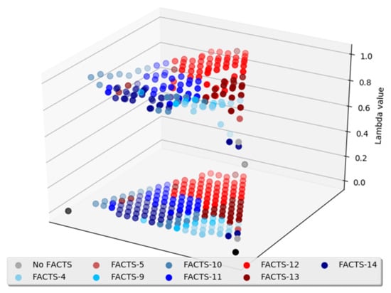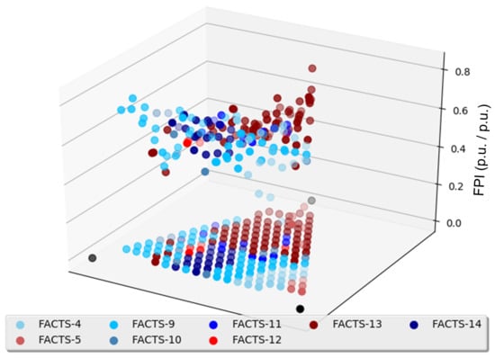 We did not make any assumption about whether maximum or minimum values of , voltage deviation or reactive power loss correspond to the base case or not. This means that these values must be computed and that the base case is treated the same as the available locations. Therefore, it is possible for the optimal choice, at any load share scenario, to be the base case. In other words, it is possible that the best option may be to not install a FACTS device.