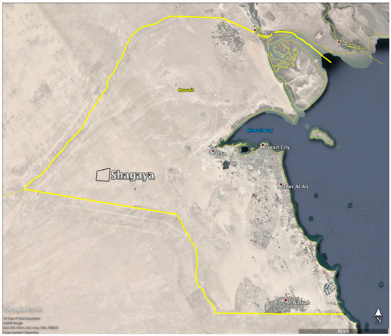 Map of Kuwait (yellow outline), with the Shagaya Renewable EnergyPark boundary (black polygon) in western Kuwait.