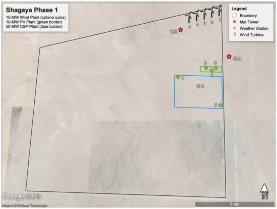 Map of Shagaya Renewable Energy Park Phase 1 installations, with Phase 1 & 2 boundary fence (black polygon), 10-MW wind plant (turbine icons), 10-MW PV plant (green rectangle), 50-MW CSP plant (blue rectangle), weather stations (yellow diamonds), and met towers (red stars).