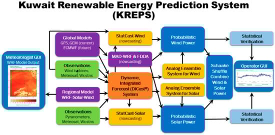 The authors would like to thank the many colleagues at NCAR who are collaborating on building the Kuwait Renewable Energy Prediction System. Alaa Ismail of KISR and staff at Kuwait’s National Control Center provided valuable feedback on the operator display design and configuration. The authors also thank Majed Al-Rasheedi of the Kuwait Institute for Scientific Research who oversees this project. Data from the Shagaya Renewable Energy Park have been provided by Elecnor (historical wind farm and met mast data), Siemens-Gamesa (real-time wind farm data), Green Power Monitor (real-time PV farm data), and KISR (historical PV farm data and other general data).