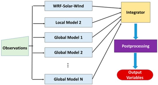 DICast is an AI method that blends the NWP model output with the observational data. It outputs weather variables of interest with lower mean errors than the raw NWP output. Figure 4 depicts the DICast process. DICast seeks to emulate the human forecaster who compares each forecast to the known observations, mentally corrects for implicit biases, then smartly blends the information to produce integrated improved forecasts [16]. Thus, optimizing according to some quantitative measure (in this case RMSE of the target variable) allows optimization of the forecast on average. For KREPS, the input observation data come directly from the wind and solar farms at Shagaya. The NWP models include a customized version of the Weather Research and Forecasting (WRF) model [17] that is configured to predict wind speed and solar irradiance for the Kuwait desert environment (WRF-Solar-Wind) [18,19]. The base DICast system for Kuwait includes the latest version of the U.S. Global Forecast System (GFS) [20,21] model (1-hourly to 120 hours, 3-hourly to 240 hours, 4x daily), Canadian Global Environmental Multiscale (GEM) [22,23] model (3-hourly to 240 hours, 2x daily), and the WRF-Solar-Wind model (15-minute output out to 48 hours, 1x daily). Thus, DICast outputs hourly forecast values for a variety of lead times, following the models that go into it. More models can be added as they become available, such as the European Center for Medium-Range Weather Forecasting (ECMWF) model.