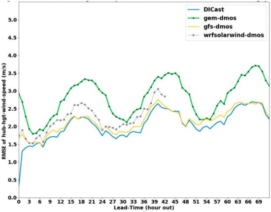 DICast results are analyzed over a twelve-month period from 1 December 2018 to 30 November 2019. Figure 5 displays DICast blending performance in terms of root mean square error (RMSE) for each lead-time, comparing the DICast forecast to that of its components after the DMOS bias corrections. In this case, the components are GFS-dmos, GEM-dmos, and WRF-Solar-Wind-dmos. Figure 5 shows hub-height wind speed (78-m wind speed) error values averaged for all 06 UTC DICast forecasts. The 06 UTC DICast uses the 00 UTC GFS, 00 UTC GEM, and 00 UTC WRF-Solar-Wind models. DICast consistently displays the lowest errors across all lead times (blue line) and the impact of FEC is evident in the first six hours of the forecast.