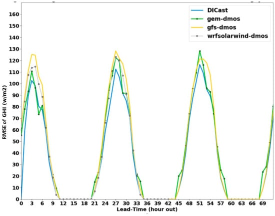 Figure 6 displays forecast RMSE for GHI (average downward shortwave radiation in the NWP models), based on all 06 UTC DICast forecasts. DICast typically shows the lowest forecast errors, but it does not show as much separation (improvement) over the other models. This can be attributed to the fact that GHI has a higher variance from minute to minute (hour to hour) compared to other variables, such as temperature and wind speed. The impacts of FEC again improve the forecast for the first three hours.