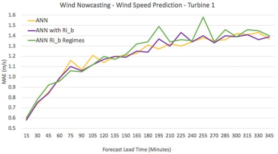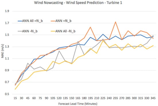 We used the bulk Richardson number (RiB) to identify whether the current state of the atmosphere is stable or unstable. RiB quantifies the ratio of buoyancy-driven turbulence to the shear-driven turbulence as described in [28]. The RiB calculation was performed using data from the nearby Elecnor meteorological tower (76-m anemometer and wind vane) and the surface weather stations (3 m for temperature and relative humidity and 4 m for wind speed and direction) in the PV farm. After the RiB was calculated for each 10-min interval to match the frequency of the observations, the datasets were merged with the DICast forecasts. Our initial test was to determine the sensitivity of the ANN to adding RiB as a predictor to the model or to separate the models by stability regime. We evaluated the performance of the methods compared to excluding RiB, and the results are displayed in Figure 7. On average, the ANN without regime separation or adding RiB as a predictor generally performs the best, but all methods perform similarly well. In the first hour of the model training the ANN separated by RiB tends to perform the worst, but transitions to performing slightly better during most of the second hour. After the second hour, the ANNs using stability regimes and the RiB as a predictor tends to have more variability in their predictions, which shows the sensitivity the ANN may have to small changes in stability; however, the errors tend to be worse, indicating that the stability models may be overfitting or over-emphasizing the effect of stability on wind speed evolution.