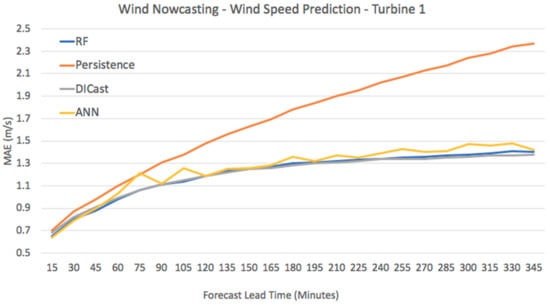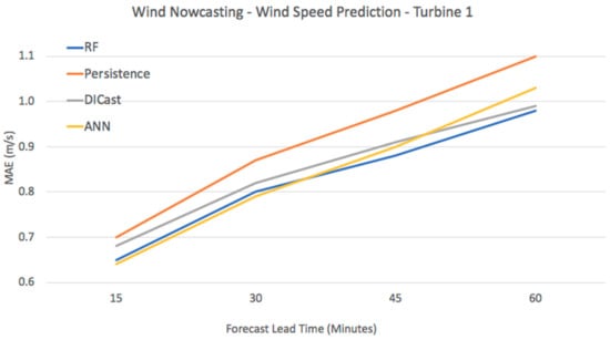 Results (MAE)for the random forest (blue line), ANN (gold line), persistence (orange line), and the DICast hub height wind speed forecast (gray line) in the first 60 min show that the RF improves upon DICast for the first hour and the ANN improves upon DICast for the first 45 minutes.