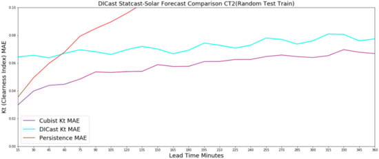 Results for the Cubist model configurations compared to the DICast forecasts of Kt and smart persistence. The Cubist-based method performs best for all time periods from 15 min to 360 min compared to either DICast or smart persistence.