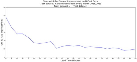 Percentage improvement of StatCast-Solar over DICast for all lead times from 15 min to 360 min.