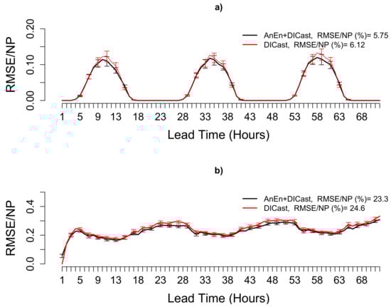 Root mean squared error for AnEn + DICast (black) and DICast (red) for solar power (a) and wind power (b). The vertical bars represent the 5%–95% bootstrap intervals that are plotted every other lead time to reduce clutter. RMSE values are normalized by the nominal power of a single turbine (2 MW) or of a single PV plant (5 MW) and they are obtained by pooling data from all wind turbines or solar plants together. The values in the legends are obtained by averaging over the lead times and are shown as a percentage.