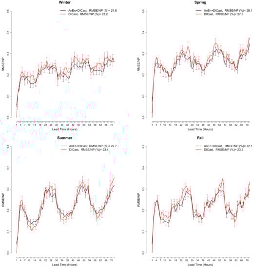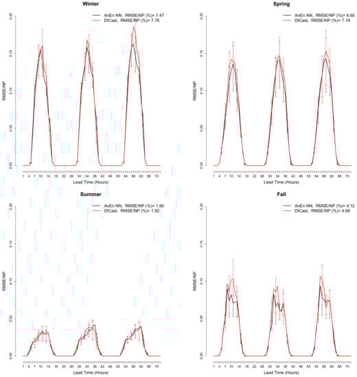 Examining the RMSE values stratified by season (Figure 14 and Figure 15), winter and spring exhibit the worst performances for solar and wind power respectively, with the AnEn + DIcast generally still slightly overperforming compared to DICast alone. The performance is highly dependent on the season for solar power because of the climatology of Kuwait, with very frequent, easily predictable, clear sky conditions during the summer [43]. For wind power, there is an enhanced daily cycle in the RMSE in the summer with higher values during the night than during the day. This is explained by higher values of the wind speed during the night driven by the development of low-level jets as explained earlier in the paper and in [27]. Thus, we have demonstrated that the AnEn can be used to slightly improve upon the DICast deterministic forecast while additionally providing probabilistic information.