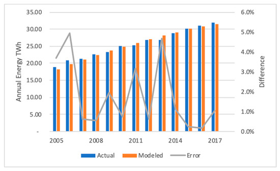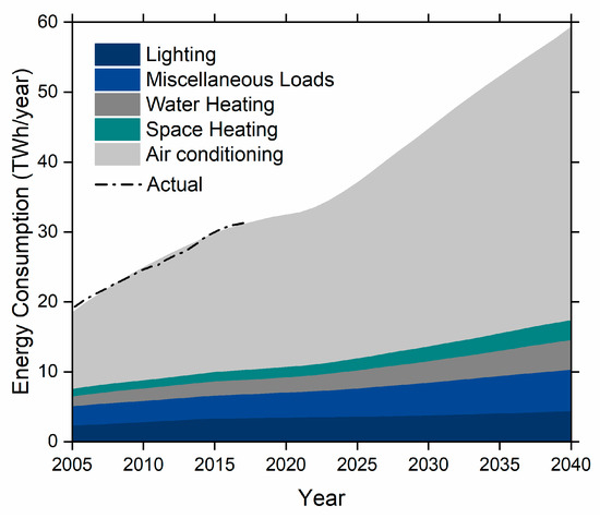 Figure 7 compares the predictions of the building energy stock model to the actual total energy consumption in Kuwait from 2005 to 2017 after a systematic calibration procedure. The actual energy consumption data were obtained from the Ministry of Electricity and Water (MEW) [