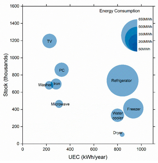 Figure 8 shows a bubble plot of the unit energy consumption of home appliances against the total stock to reveal the energy usage. The additional dimension, the size of the bubble, represents the total annual energy consumption. Household appliances included in the analysis consist of televisions (TV), personal computers (PC), washers, irons, microwave, refrigerator, freezer, water cooler, and dryers.