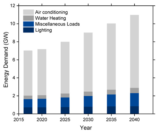 This work presents a bottom-up approach for modeling and forecasting end-use energy consumption and demand in Kuwait’s residential buildings up until 2040. The methodology relies on information pertaining to the energy consumption of specific household equipment and appliances, where factors such as quantity, operating hours, and power requirements are accumulated and extrapolated to a national scale to ultimately estimate the usage patterns in Kuwait. Therefore, energy consumption and demand are calculated at the individual level and aggregated to estimate the national consumption and demand. In this model, end-uses were broken into air conditioning, lighting, appliances, and space heating and water heating, and further sub-categorized by different technologies. Moreover, each end-use category was further broken down by different equipment and appliances with corresponding data on diffusion rates and energy efficiency ratings. The rate of diffusion was based on data obtained from surveys and the available literature [