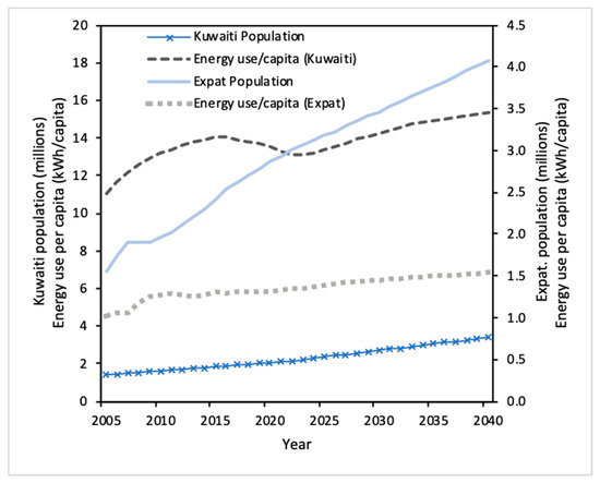 Figure 12 displays the forecast of electrical consumption for Kuwaiti and expatriate (non-Kuwaiti) households until the year 2040. Despite the slow growth in population, the forecast analysis indicates that the Kuwaiti energy consumption per capita was significantly higher than that of the expatriates, reaching levels of 15 MWh. The values for expatriates were almost stagnant, staying well below 1.5 MWh, despite the growing population figures that are expected to reach four million, more than doubling since 2005. The results are also represented in tabular form in