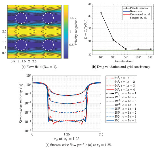 Reliability of the pseudo-spectral scheme together with the Brinkman penalization technique, as well as the accuracy of the drag force computed from Equation (17) have been previously studied and approved for both 2D and 3D simulations at moderate to high Reynolds numbers [37,38]. However, for low Reynolds number flows, we need to verify the accuracy and perform the grid consistency study. In this regard, we solved a flow problem for an in-line cylindrical fin configuration with the pitch-to-diameter ratio of 0.4 at and set upstream velocity to 1. Figure 1a demonstrates the periodic flow field across a circular array. Note that only four computational domains (2-by-2) are plotted in this case to demonstrate the periodicity in the flow field. The white dashed line represents the penalized domain () wherein . We also perform a series of simulations by varying the domain discretization size (N) in order to check grid consistency and compare the calculated drag with previous studies.