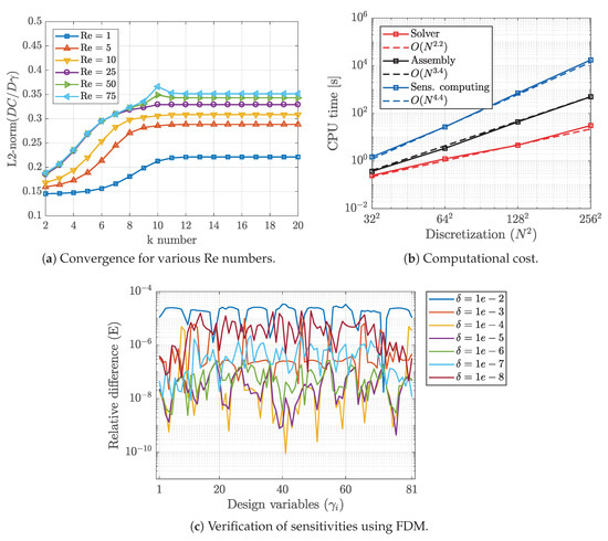We point out that we derived the discrete sensitives of the pseudo-spectral fluid solver via an analytical process and direct differentiation. However, in general, for other complex flow solvers such as finite volume method (FVM) with an iterative SIMPLE scheme [42], exact sensitivity derivation is not straightforward [15], and often this crucial task is delivered to automatic differentiation (AD) tools [43,44]. AD tools are accurate to the machine precision, but they normally require significant amount of memory and are sometimes very time consuming. In addition, computing the required sensitivities are performed using discrete adjoint method [45]. This is a commonly utilized approach to reduce computational costs independent of number of design variables. Adjoint method, however, requires solving a linear system of equations, while the present approach does not require solving any system of equations, its cost is also independent of design variable numbers and relies only on the basic matrix operation, which could be easily implemented and computed via parallel processing.