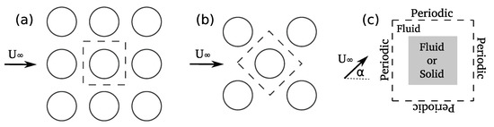In this section, we study several test problems to investigate the utility and flexibility of the present topology optimization approach for fin array drag (pressure loss) minimization. As illustrated in the schematic Figure 3a,b, we consider two fin array configurations: in-line, and staggered () alignments. Figure 3c presents our computational model as well as the design space. The dashed square area represents the periodic computational domain , and the gray area shows the design domain . We take as the characteristic length, and circular fins as the reference design. Length of the design domain () varies between and L, depending on the simulation case. For consistency among different simulations and fin shapes, we always calculate Reynolds number based on the characteristic length . In addition, for sake of convenience, we rotate upstream flow direction by to model staggered array instead of rotating computational domain (compare Figure 3a,b).