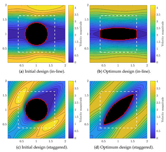 Figure 5 shows the initial and optimal fin topologies as well as the flow velocity field, for both in-line and staggered arrays at . For in-line array, as shown in Figure 5b, the optimum design is stretched stream-wise to increase the cross-section aspect-ratio and reduce the frontal area to for a more hydrodynamic fin. The upper and lower surface curvatures facilitate the flow from tip to tail, because the main flow stream has a periodic converging–diverging format. As the result, the optimal design features ∼39% less drag force, as listed in Table 1. The first reason is that the frontal area is now smaller than the initial circular fin and each fins. The second reason is that the increased gap space between fin rows reduces the maximum flow velocity, and consequently the exerted drag force. We should also note that the front and end of the optimal fins are attached to the the border of design domain. This is not surprising, since at the viscous drag is less severe than the pressure drag, and theoretically we know that parallel plates produce minimum drag. Therefore we observe that by increasing , the optimizer minimizes the pressure drag by increasing gap space between fin rows and filling the gap space between upstream and downstream fins, until the fins are fully attached and a uniform parallel channels are created.