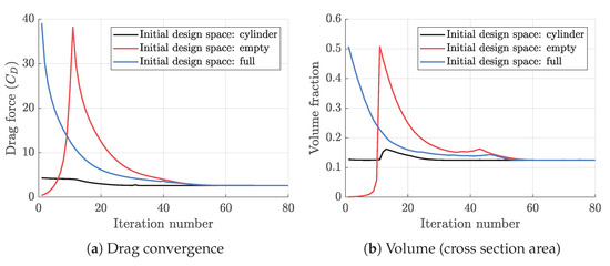 In case (b) of the first example, our goal is to investigate the robustness of our TO tool by examining different initial values for design variables and compare the final optimum topologies to verify whether the results are insensitive to the initial (unoptimized) designs. For this purpose, we repeat the previous topology optimization example of staggered configuration in case (a), but we set all the initial ’s to either 1 (full solid) or 0 (no solid) and compare them with the initial circular fin. We note that the same volume constraint as the circular fin of case (a) is imposed; therefore, starting the optimization with no solid area violates the volume constraint in the beginning, however, we expect the optimizer to eventually satisfy that. Figure 6 illustrates the topology optimization process for those three different initial designs, and Figure 7 shows the convergence history of the drag forces, as well as the total fin volumes. We note that the optimization process for circular and full initial designs are rather smooth, because the optimization starts from feasible design space. On the other hand, for the case of empty initial design, the optimization process begins from infeasible state; therefore, the optimizer uniformly fills the design domain to first satisfy the minimum volume constraint (near to iteration 10), and then continues an optimization process similar to full solid case. Regardless of the starting phase, all three cases reached similar final topologies with closely identical drag forces. We also obtained similar performance for in-line configuration, and overall, we find the optimization processes promisingly insensitive to the initial design which confirm the robustness as we desired.