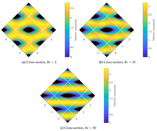 Therefore, instead of iterating over Equation (26) for every single step of m, we only compute at , which leads to an extremely fast convergence. More precisely, for solution of Equation (26), matrix additions and multiplications are required if ; on the other hand, only k matrix additions and multiplications are required for Equation (29). Numerical experiments, as shown in Figure 2a, suggest that reasonably converges after only iteration steps for Reynolds numbers up to 75, where the flow remains laminar and steady-state.