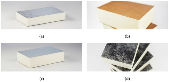 The flexible facings are generally made of mineral fleece, glass fleece, aluminum foil, or composite film [13]. Depending on the type of facings of the PIR board, flexible-faced or rigid-faced PIR foam boards could be distinguished [12]. The choice of facing usually depends on the wall construction where the PIR thermal insulation will be installed. For example, PIR faced with thin aluminum foil is commonly used as exterior or interior continuous thermal insulation for masonry or concrete wall systems and in residential and commercial wood framework construction. PIR with plastic facing is usually used in the production of precast insulated concrete sandwich panels and in the construction of cast-in-place insulated concrete walls. The same applications exist for PIR faced with composite paper foil. Different types of facings are shown in Figure 1.