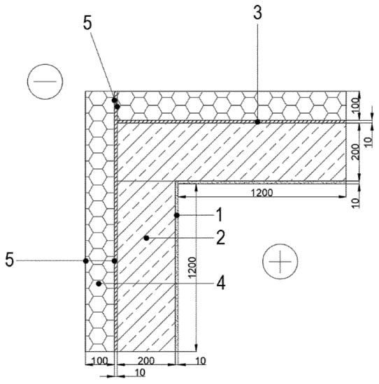 Fragment of the wall corner: 1—plaster, 2—aerated concrete blocks, 3—PU foam, 4—PIR insulation, 5—PIR facings (see Table 1) (all the dimensions are expressed in millimeters).