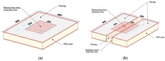 The specimens for experimental measurement were made from two 100 mm thick PIR boards with aluminum foil tin facing and multilayer aluminized facing. For initial R-value measurement, PIR boards (dimensions 600 × 600 mm) with facings as produced were used, and after that, a strip 100 × 100 mm in width (equal to thickness of specimen) with facings was cut from the center of the specimen and rotated 90 degrees to expose the facings to the middle of the specimen (Figure 3). Thus, in the new specimen, a facing appeared in the direction of the heat flow, forming a linear thermal bridge.