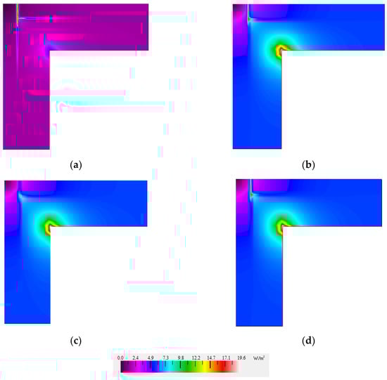 The heat flow rate through the corners of the wall insulated with PIR, faced with different facings: (a) aluminum foil, (b) multilayer aluminized facing, (c) composite paper facing, (d) plastic facing.