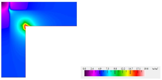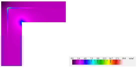 Given that the results of PIR with aluminum facing were different from other options and the corners with the rest of the facings had identical values, it was decided to analyze the corner, insulated with PIR board without facings. Figure 5 shows the intensity of heat flow through the corner insulated with PIR without any facings, but with PU glue in the joint between two boards.