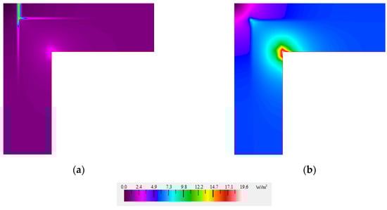 The linear thermal bridge was calculated, and its value was Ψ = −0.005 W/(m·K) for the wall corner insulated with aluminum foil-faced PIR (Figure 7a) and Ψ = −0.041 W/(m·K) for the wall corner insulated with PIR without facing (Figure 7b). As can be noticed, when calculating the thermal bridge of the wall corner insulated with PIR with other than aluminum foil facings, PU glue in the corner joint between two boards could not be evaluated. The difference of heat flow between these two variants was ΔΦ = 0.72 W/m, and this meant that not using PU glue in the joint, the heat flow through the wall corner constructions rose.