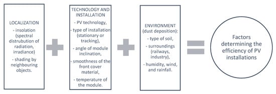 The amount of solar radiation reaching the front cover of a photovoltaic module is crucial for its performance. A number of factors must be taken into account at the design stage of the solar installation, which will ensure maximum utilization of the potential arising from the location. During the operation of a photovoltaic installation, it is necessary to limit the shading of the modules caused by both dust and shadowing by trees or other objects. The article presents an analysis of the impact of the radiation reaching the surface of the radiation module on the efficiency obtained. Each of the analyzed aspects is important for obtaining the greatest amount of energy in specific geographical conditions. Modules contaminated by settling dust will be less efficient than those without deposits. The results of experimental studies of this effect are presented, depending on the amount of impurities, including their origins and morphologies. In practice, it is impossible to completely eliminate shadowing caused by trees, uneven terrain, other buildings, chimneys, or satellite dishes, and so on, which limits the energy of solar radiation reaching the modules. An analysis of partial shading for the generated power was also carried out. An important way for maximizing the incoming radiation is the correct positioning of the modules relative to the sun. It is considered optimal to position the modules relative to the light source, that is, the sun, so that the rays fall perpendicular to the surfaces of the modules. Any deviation in the direction of the rays results in a loss in the form of a decrease in the available power of the module. The most beneficial option would be to use sun-tracking systems, but they represent an additional investment cost, and their installations require additional space and maintenance. Therefore, the principle was adopted that stationary systems should be oriented to the south, using the optimal angle of inclination of the module surface appropriate for the location. This article presents the dependence of the decrease in obtained power on the angle of deviation from the optimal one.