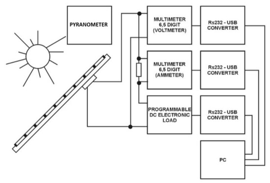 For the purpose of the experiment, a research station was designed and for measuring the current–voltage characteristics of photovoltaic modules and is presented in Figure 3.