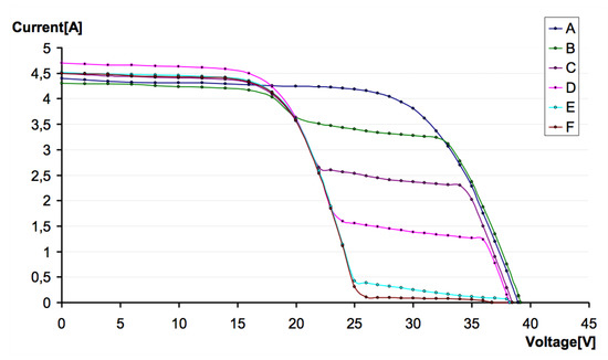 PV module SF 150/10A-155 was chosen to conduct the research. All measurements were obtained for solar irradiation of 900 W/m2. Figure 5 shows the current–voltage characteristics for different configurations of the module shading.