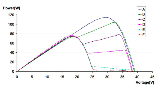 The power generated by the SF 150/10A-155 module for tested configurations of shaded module A–F (according to Figure 4).