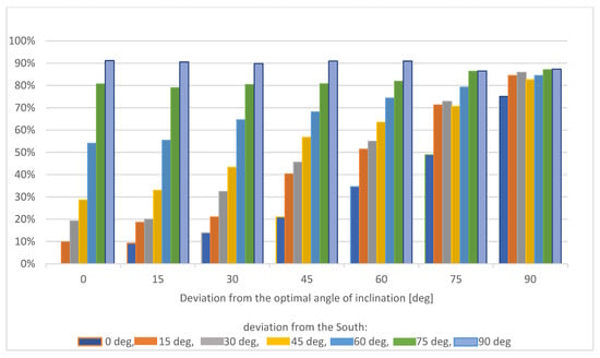 Figure 7 presents the percentage loss of energy obtained by the installation for selected deviation values in relation to the optimal location of the modules.