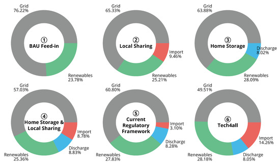 Following the work of Lüth et al. [23], we apply their three additional market designs to the presented case study. These designs aim at investigating the post feed-in tariff era, and thus feed-in will not be considered in any of the following designs, that is, is fixed to zero. First, the possibility of trading is enabled, that is, supply and demand are balanced locally before the procurement from the grid. This is implemented by adding a further constraint on top of ① BAU Feed-in that links the players and represents a local market clearing. In the scenario ② Local Sharing with self-consumption and local sales a household can hence additionally procure electricity from the local production at rate where . This local electricity stems from households’ excess generation that is fed into the local grid and remunerated at the same local rate . This local rate is determined within the optimisation of the mixed complementarity model originating from the dual variable of Equation (16), as this equation clears the local trading balance. Second, residential energy storage facilitates a number of households to privately store their own generation: In the design ③ Home Storage with self-consumption and own storage, a household can consume electricity from the own battery at a discharge rate equal to a levelised cost of storage (see also Crespo Del Granado et al. [51] for a similar approach) instead of trading within the community. Excess production can, thus, be stored in the home storage if available and used, for example, for load shifting purposes. In Germany, there exist some business models that specifically sell combined PV and battery storage installations with the most popular being the sonnenCommunity. The home storage systems assumed in this paper have an installed capacity of 4 kWh or 6 kWh. For a specific description of their characteristics, please refer to Appendix B and Table A2 at the same place. The scenario ④ Home Storage & Local Sharing with self-consumption, own storage, and community sharing combines ② with ③, allowing for local sharing and battery storage.