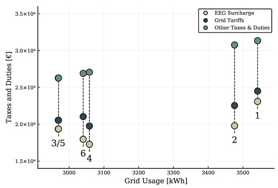In this section, we test a further case ⑤ Current Regulatory Framework with self-consumption, own storage, community sharing, and current taxes and duties, for which we introduce current German regulation to ④. Consumption from the local balancing mechanism is then charged at a varied as the German regulatory framework does not make exemptions from paying grid fees and surcharges once the electricity is passing the public grid. See the Excursion Box for details on the German regulatory framework. The results show that due to the higher costs, benefits of the local trade shrink significantly. In order to have any benefits for participating players in a ④ Home Storage & Local Sharing market, the taxes and duties structure would need to be adjusted as argued by Schäfer-Stradowsky and Bachmann [53] and Scheller et al. [36]. In their report, von Oppen et al. [54] show that trading among neighbours or within a community is highly uneconomic as well as not manageable for small prosumers due to a compact regulatory framework that would lead to high costs as well as a major amount of administrative work. We summarise the obligations and implications for prosumers in a local trading scheme in the German regulatory framework in Appendix C.