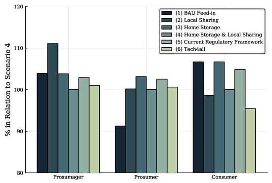 We conclude that these market designs could lead to a redistribution of costs for the network, which will be at the expense of a pure consumer—most likely a household without own property or less affluent—who might not have the same evasion possibilities as prosumers (we entitle this the proverbial dentist effect). Figure 4 gives a summary of the costs. We benchmark the different market designs against ④ Home Storage & Local Sharing where all features are enabled, and cluster the households in groups of prosumagers (residential technology and storage), prosumers (residential technologies) and pure consumers. For some, ① BAU Feed-in is still the cheapest option because their feed-in tariffs on their large excess production result in high remuneration profits. However, for the majority of the community costs decrease along with the introduction of local trading and storage under the presented market designs.
