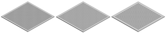 Sound-absorbing perforated panels are commonly used in office rooms, and because of their design, these panels can carry out the function of an air diffuser without modification. Several types of perforated panels are available on the market, differing in the dimensions, perforation shape, size, and material. For this research, three perforated panels were designed based on actual commercial models; see Figure 1. All the panels had dimensions of 600 × 600 mm and square perforation. The perforation size and rate are shown in Table 1.