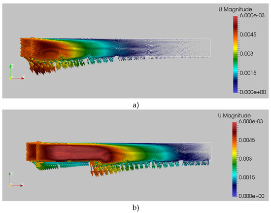 In a previous work [13], we performed a series of CFD simulations to evaluate the velocity profile of the ventilation air leaving the perforated panels for different panel configurations. The calculations were isothermal, and the only driving force for the ventilation air was assumed to be mechanical. The influence of buoyancy forces on the ventilation performance was excluded. The aim was to find an optimal distribution of the three panel perforations for a room of a certain length (namely 3.6 m). Some of the results are reported in Figure 2. The vector diagram in Figure 2a presents the results obtained using a uniform panel distribution (6× Panel C). It is evident how the velocity profile resulted in being uneven and how the largest part of the fresh ventilation air was injected into the room in the first part of the plenum, taking the plenum inlet as the starting point. Figure 2b presents the result for one of the two optimal configurations determined in [13], a distribution of 2 Panel As, 2 Panel Bs, and 2 Panel Cs with reference to the nomenclature used in Figure 1. The order of these panel was assumed with respect to the plenum inlet taken as a starting point. In both calculations, the amount of ventilation air was kept constant and calculated according to [14]. An equally well performing configuration was found to be 3 Panel As, 2 Panel Bs, and 1 Panel C. Table 2 shows the highest and lowest velocities calculated per panel type and for each configuration in [13].