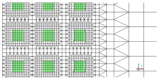 Due to the presence of panel perforation, the numerical simulations required a very fine mesh, capable of calculating the flow in the small holes, as well as in the main volume of the room. Figure 5 shows a close view of the ceiling mesh, where the cells colored in green represent the suspended ceiling perforation.