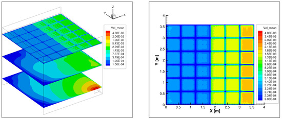 The average velocity fields (Vel_mean in the contours) are shown in Figure 7, Figure 8, Figure 9 and Figure 10. On the left side, the contour shows the velocity values on three horizontal planes, while on the right side, a more detailed contour of the top planes is shown, for each of the cases. The three planes were respectively the plane at 4 cm below the perforation, the horizontal mid-plane of the room volume (i.e., half of the distance between the suspended ceiling and the floor), and the plane that cut in the middle Outlet 1 surface. For the alternative configuration (Outlet 2), the bottom plane was kept at the same height. Therefore, it did not show the velocity field at the outlet, but gave a better comparative view of the room velocity field. The distance of the top plane from the perforation was chosen considering that distance to be sufficient for a full development of the flow leaving the ceiling diffuser.