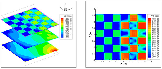 Velocity contour: three horizontal planes (left); the top plane below the ceiling (right) for the chessboard distribution in configuration Outlet 1.