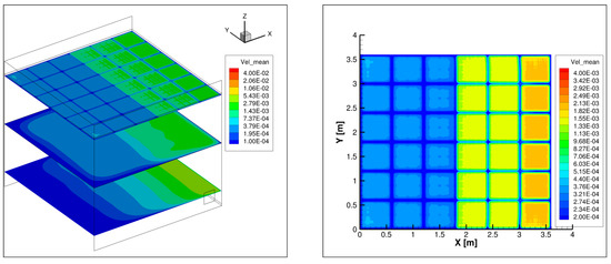 Velocity contour: three horizontal planes (left); the top plane below the ceiling (right) for the chessboard distribution in configuration Outlet 2.