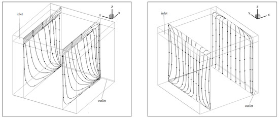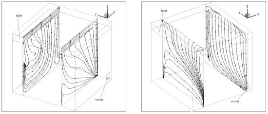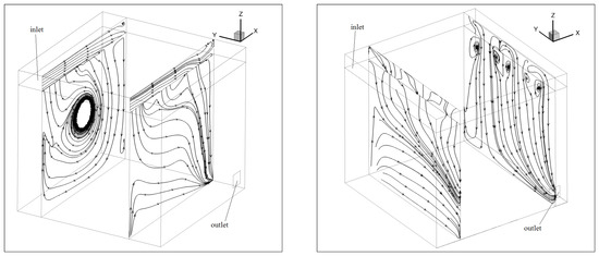 Figure 11, Figure 12, Figure 13 and Figure 14 show the streamline representation of the flow from the plenum inlet to the room outlet. In particular, the left part of each figure presents two planes parallel to the xz-plane, therefore roughly parallel to the main direction of the flow (from inlet to outlet). The planes were placed respectively at a distance y = 0.8 m and y = 3 m from the origin of the reference system (lower-right corner in Figure 11, left). The right part presented two planes parallel to the yz-plane, roughly cutting the inlet-outlet flow. In this case, the position of the planes was respectively x = 0.66 m and x = 3.28 m. The domains in the right part were slightly rotated to avoid the superimposition of the planes for better visualization.
