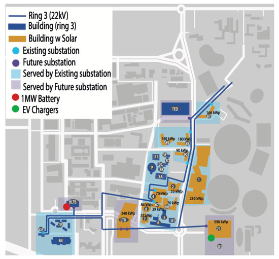 Monash Microgrid includes a range of customers and DER assets and is located at the Clayton campus, 20 km southeast of Melbourne’s central business district. The microgrid network indicating different assets and their location is presented in Figure 3. The campus microgrid is composed of controllable loads totaling 3.5 MW, 1 MW of solar generation, two 22 kW EV chargers, and 1 MWh of battery storage. The energy management of these DERs and the microgrid as a whole will be achieved through the deployment of a smart microgrid platform. The microgrid’s 3.5 MW controllable loads are the combination of the 20 mixed use and multi-tenanted buildings. The microgrid connected buildings closely replicate a real community with a variety of old and new buildings and a wide diversity of load profiles that emulate high occupancy spaces (arts theatre, laboratories and lecture theatres), light industrial (swimming pool complex), commercial (retail and staff offices) and residential (self-contained apartments).