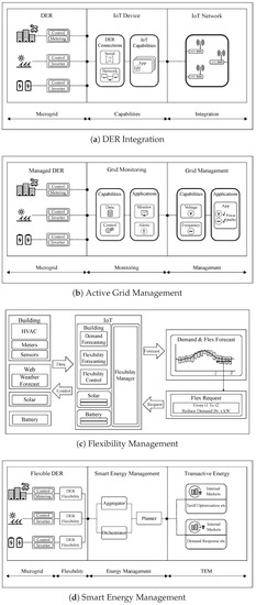 The detailed illustration of the enablement layers of transactive energy management is given in Figure 5. The DER Integration layer (Figure 5a) is a combined hardware and software deployment and integrated with each DER. An IoT Edge device is deployed on each DER with direct connections to the DER control systems and metering. A containerized IoT platform is installed on each device to provide a base for extending DER with data and control capabilities. Fundamental to the IoT platform is the decentralized transport of messages between nodes using a secure IoT message bus. It is crucial that DER can securely communicate with other DERs in the microgrid.
