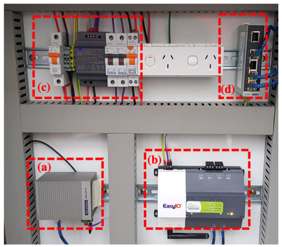 The integration design for buildings differ slightly in that while the specified building controller also enforces a network separation, the controller also performs additional functionality beyond just proxying communication. There are a variety of different building automation systems (BASs) deployed across the 20 buildings, and the functionality to map a common control interface to the individual BAS control actions should be implemented as extensions to the building control and not as IoT functions. By adding smart building controllers as the entry point to all BAS systems, a platform can be deployed encapsulating the complexities of exposing BAS control under a common campus standard for building control. Figure 6 shows the physical installation of the integration design for a building DER. The common cabinet form can be seen to house the IoT device (a), the building controller (b), along with their supporting electrical switches (c), and internal networking interface (d).